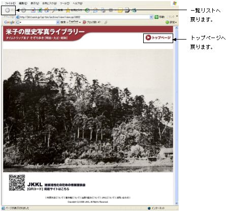 写真を見終わったら、ブラウザの「戻る」ボタンで戻るか、 「トップページ」へ戻ります。 このようにして、米子の歴史写真を、エリア別に見ることが出来ます。